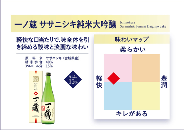 ■蔵元:一ノ蔵(宮城県大崎市松山) ■原料米:ササニシキ100%(宮城県産) ■精米歩合:40% ■日本酒度:−3〜−1 ■アルコール分:15% |